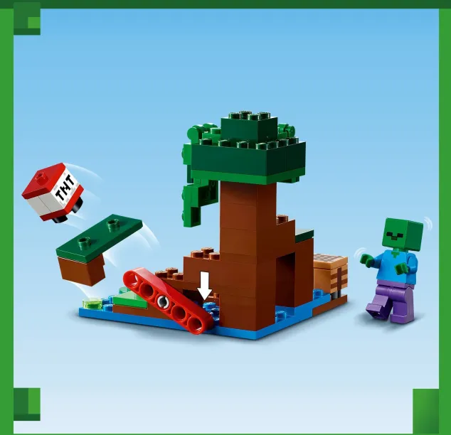 LEGO Minecraft The Swamp Adventure (21240). Ακολουθήστε την Alex καθώς ταξιδεύει στον βάλτο. Υπάρχει ένας φιλικός βάτραχος για να σας κρατάει συντροφιά καθώς χτίζετε και εξερευνάτε. Αλλά προσέξτε – ένα ζόμπι και μια γλίτσα σας περιμένουν! Βοηθήστε την Alex να χρησιμοποιήσει το τσεκούρι της για να αποκρούσει τους εχθρικούς όχλους, ενώ εσείς χειρίζεστε το μοχλό για να πυροδοτήσετε το TNT!