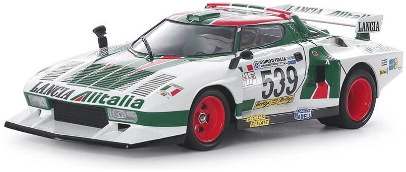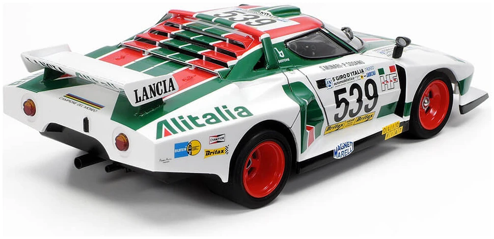 The powerful form of the Lancia Stratos Turbo with chin spoiler, over fenders, roof spoiler and rear wing is authentically recreated in style.