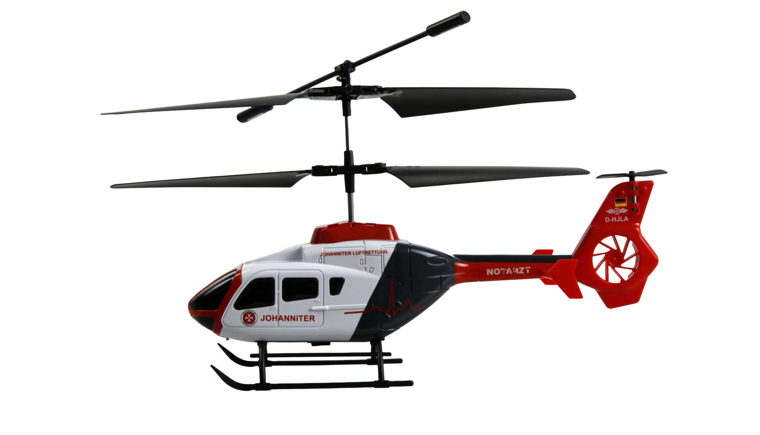 The EC135 CX Johanniter coaxial helicopter is an officially licensed model of the Johanniter air rescue service and offers an exciting flying experience for young pilots aged 8 and above. Thanks to its coaxial rotor technology, it is particularly stable and easy to fly – ideal for beginners who want to gain their first experience with remote-controlled helicopters. The fully equipped RTF set includes a remote control, battery and charging cable. Functions such as auto-start and auto-landing at the touch of a button make your first attempts at flying even easier. The interference-free 2.4 GHz system ensures a reliable connection, while the robust hard plastic fuselage forgives even minor landing errors. Two speed settings are available for varied flights, and the switchable LED rear light increases visibility. The helicopter is even suitable for outdoor use in calm conditions and has a pure flight time of up to eight minutes. The easy battery change allows for short charging breaks and quick reflight, making the EC135 CX Johanniter an ideal model for an uncomplicated introduction to the world of remote-controlled helicopters.